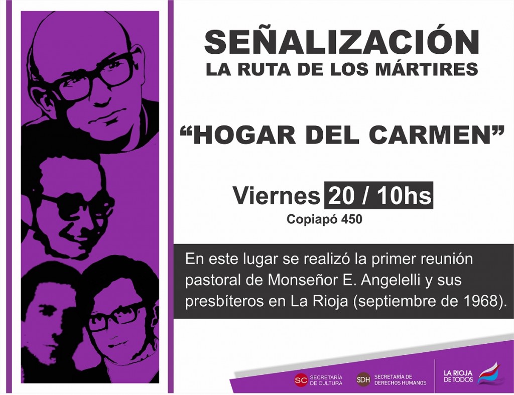Este viernes 20 de septiembre, se señalizará el “Hogar del Carmen”, como parte del recorrido que realizó Monseñor Enrique Angelelli en La Rioja, denominado “Ruta de los Mártires riojanos”. El acto se llevará a cabo desde las 10, en calle Copiapó 450, lugar donde sigue funcionando el Hogar.