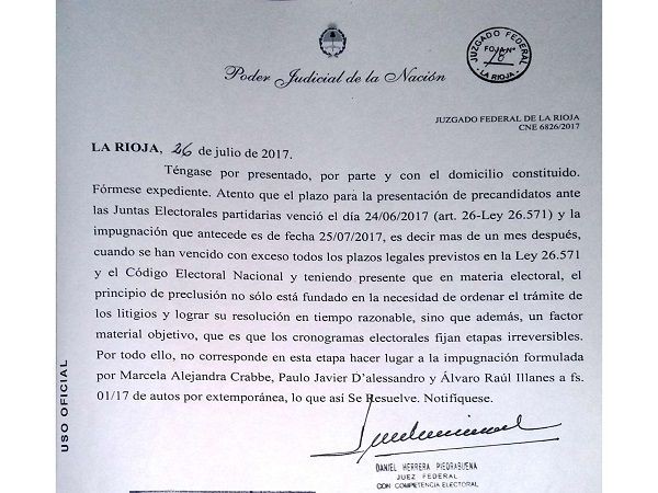 El documento lleva la firma del Juez Daniel Herrera Piedrabuena y es en respuesta a la presentación efectuada por el dirigente Leonel Acosta. Según especulaciones identico resultado obtendria la impugnacion interpuesta por los ciudadanos Crabbe, D´Alesandro e Illanes.