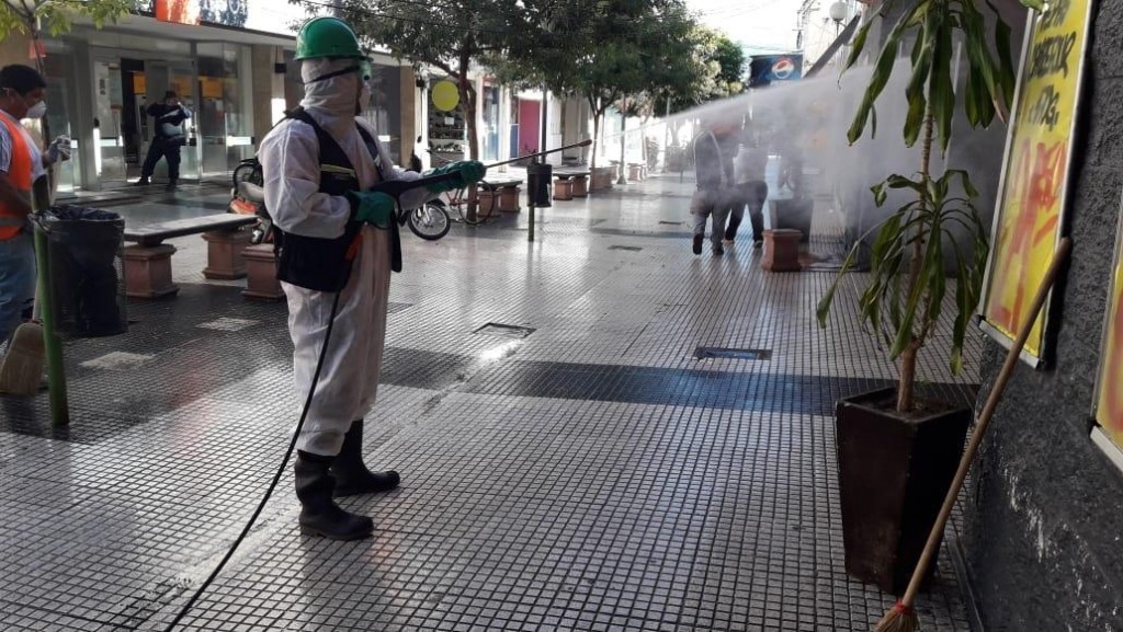 Las brigadas de protección ciudadana actuaron con solución clorada en los comercios y entidades financieras de la calle y peatonal 25 de Mayo y Buenos Aires, en los ingresos del supermercado Mayor y en los cajeros ubicados en el palacio Municipal.
