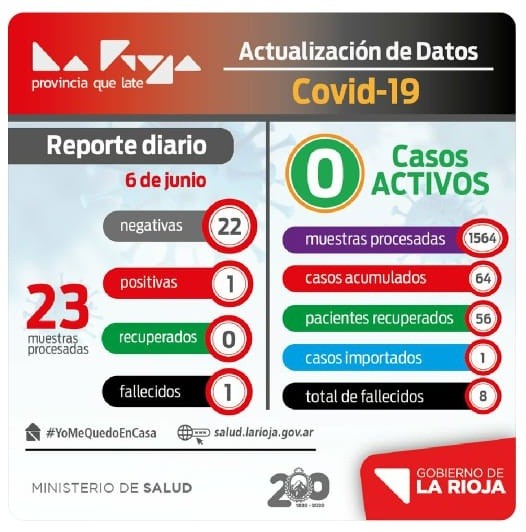 Con este nuevo caso, La Rioja suma 64 casos acumulados y 8 fallecimientos, recordemos que los 56 restantes ya superaron la enfermedad.