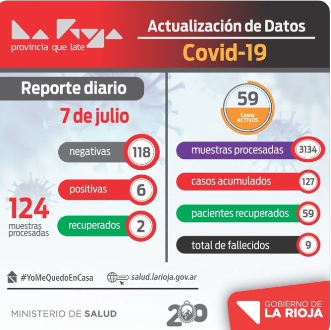 La Rioja va realizando 3134 muestras para COVID-19, registrando 127 casos positivos acumulados, con 59 personas recuperadas, 59 casos activos y 9 fallecimientos.