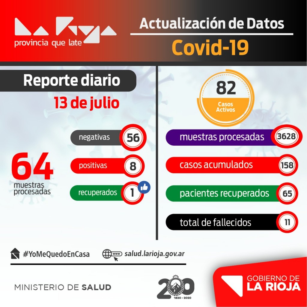 El reporte de la jornada, indica que se realizaron 64 muestras y 8 resultaron positivas, con lo cual se eleva el numero de infectados a 158 acumulados desde que comenzó la pandemia. Además, se suma una persona recuperada y el total de casos activos es de 82.