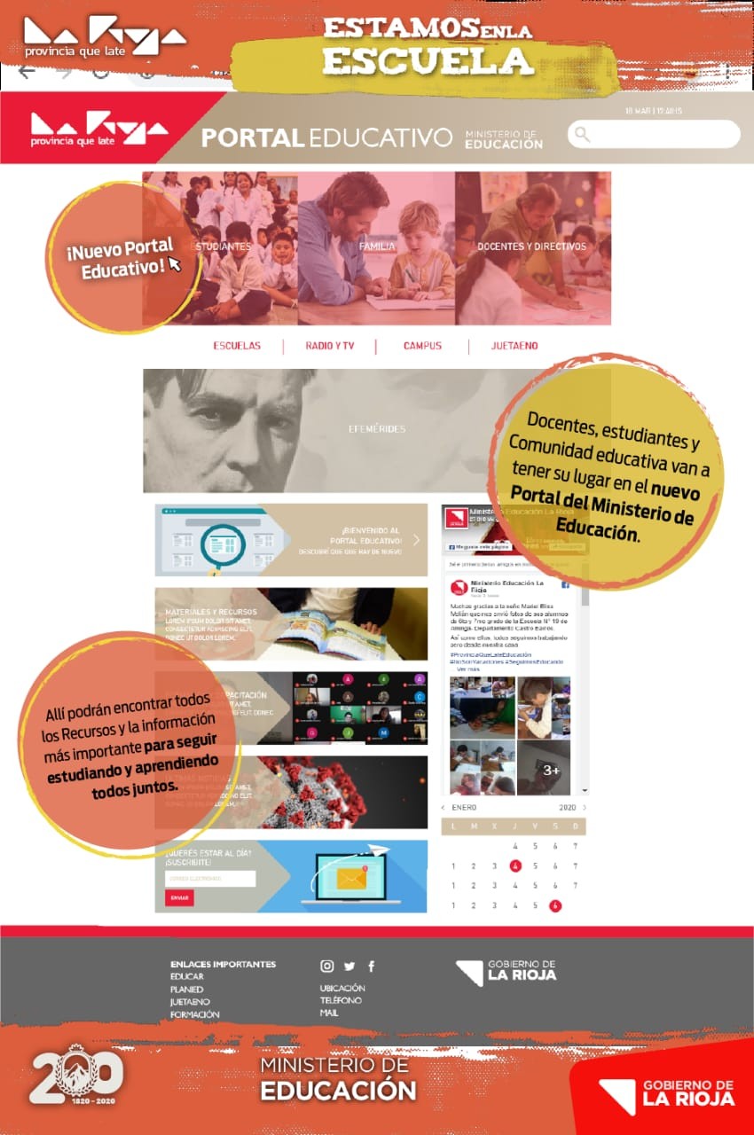 El Gobierno de La Rioja, mediante el Ministerio de Educación presentará este miércoles 22 de julio, el Portar Educativo Virtual y el cuaderno educativo "La Escuela en Casa" con el principal objetivo de garantizar el derecho a la educación a los riojanos y riojanas, por intermedio de herramientas pedagógicas e inclusivas.