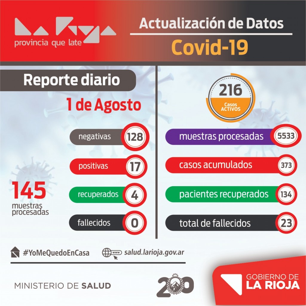 En el primer día de agosto, se procesaron 145 muestras y 17 resultaron positivas para COVID-19. Se trata de seis mujeres y once hombres , de los casos, quince son contactos estrechos y dos se estudia el nexo epidemiológico. La Rioja tiene 373 casos acumulados, 134 personas recuperadas, 216 casos activos y 23 fallecidos.