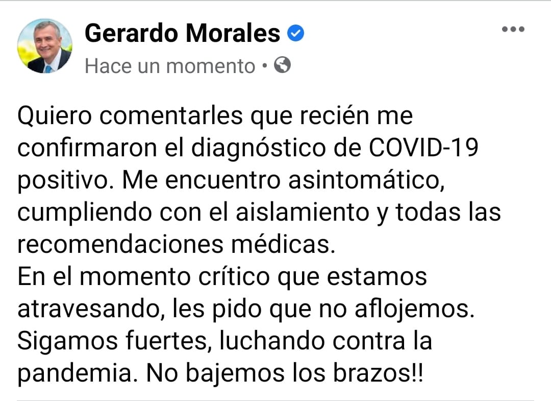El gobernador de Jujuy Gerardo Morales confirmó a traves de su cuenta de twitter que el hisopado realizado en el dia de ayer resultó positivo para coronavirus
