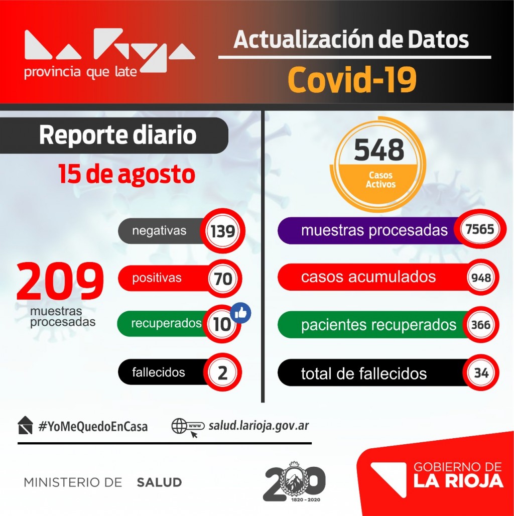 "Lamentamos informar que este sábado fallecieron dos hombres, uno de 70 años que se estaba internado en el Hospital de Clínicas y otro de 47 internado en el Hospital Vera Barros, ambos eran pacientes COVID-19 positivos", menciona el parte y con estos decesos, ya son 34 los fallecidos por COVID-19 en La Rioja.