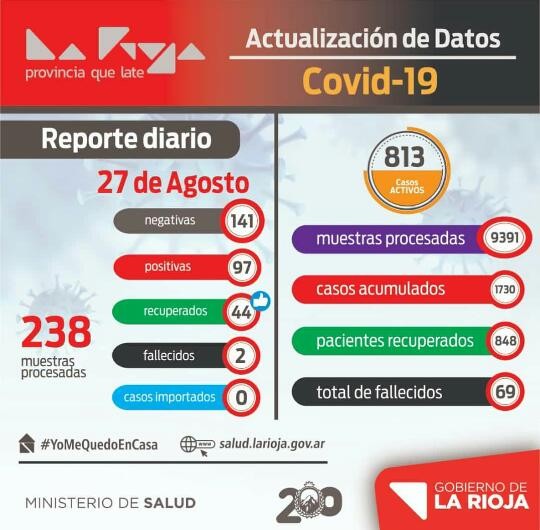 El informe diario que brinda el gobierno provincial, indica que este jueves se procesaron 238 muestras, de las cuales 97 resultaron positivas. Además se informó el fallecimiento de dos mujeres internadas en el Vera Barros.