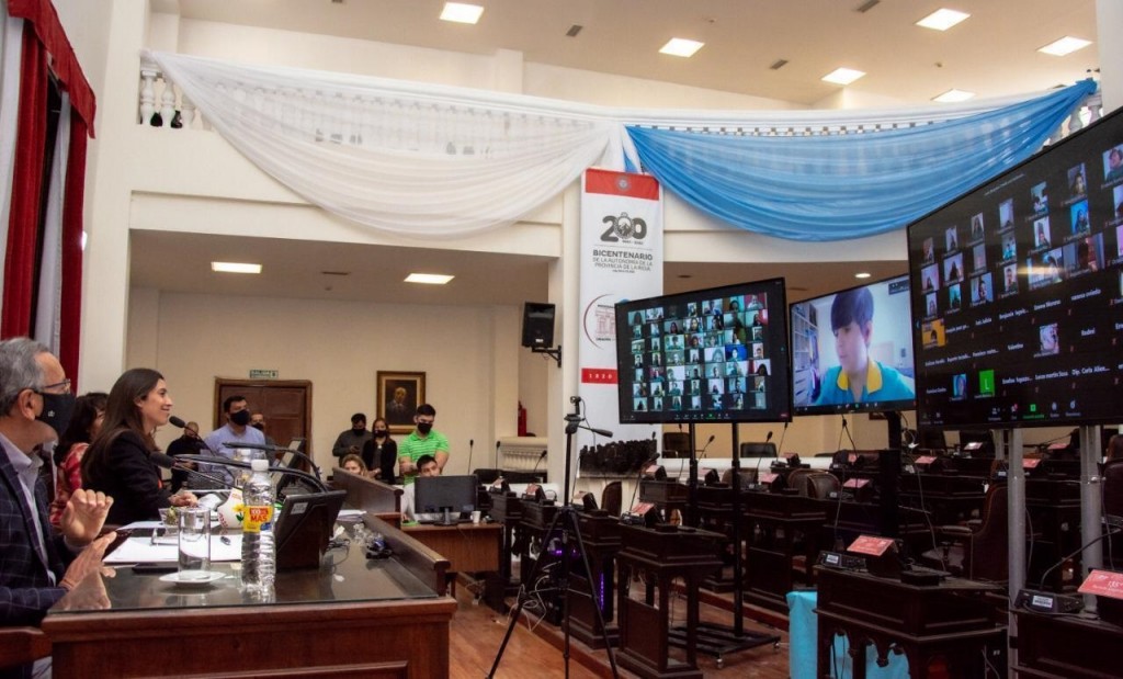 Alumnos de 7° grado de la escuela Pio XII ocuparon las bancas virtuales y realizaron el Parlamento Juvenil, que presidió la vicegobernadora, Florencia López. Tras una hora de debate, se aprobaron proyectos de ley sobre el cuidado del medio ambiente y el fomento del turismo a través del deporte. La iniciativa fue propuesta por el diputado Pedro Goyochea.
