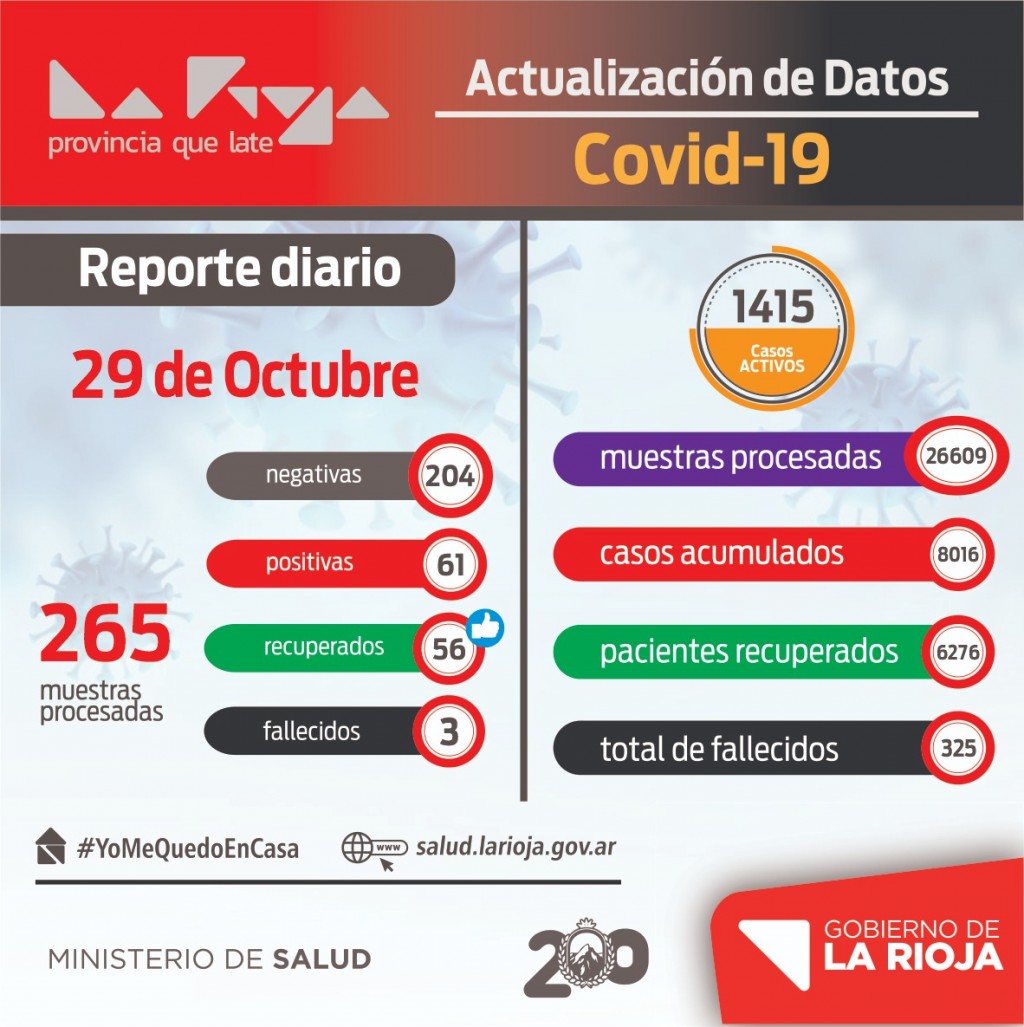 El informe oficial indica que "en nuestra provincia estamos atravesando el día 216 de la pandemia, con un total de 26609 muestras. En estos momentos tenemos 8016 casos acumulados, hoy se recuperaron 56 personas, haciendo un total de 6276 recuperados, tenemos 1415 casos activos y 325 fallecidos".