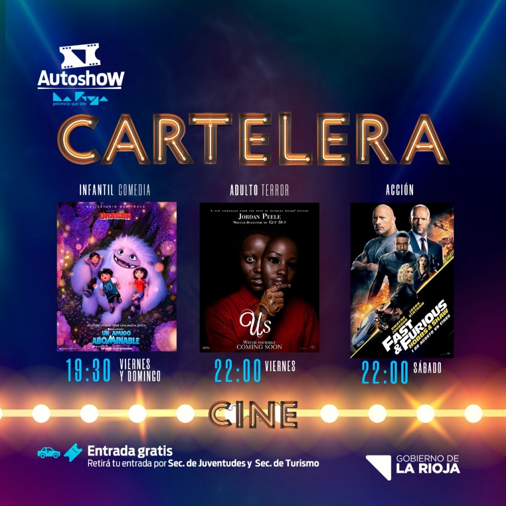 En la oportunidad se proyectarán tres películas: el viernes 27 y domingo 29 a las 19:30 horas “Un amigo abominable”, para el público infantil; el viernes 27 a las 22 horas, “Nosotros” película de género terror para adultos; y el sábado 28 a las 22 horas “Rápido y Furioso: Hobbs & Shaw”.