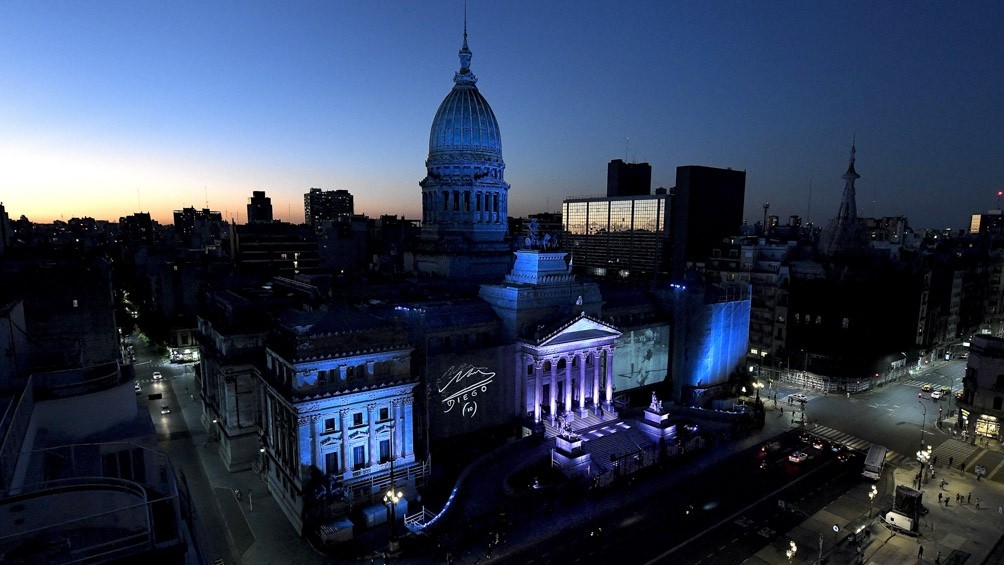 A modo de homenaje, sobre la fachada del Palacio Legislativo de la Nación se proyectaron los colores de la bandera argentina y las imágenes de los mejores momentos del ídolo futbolístico.