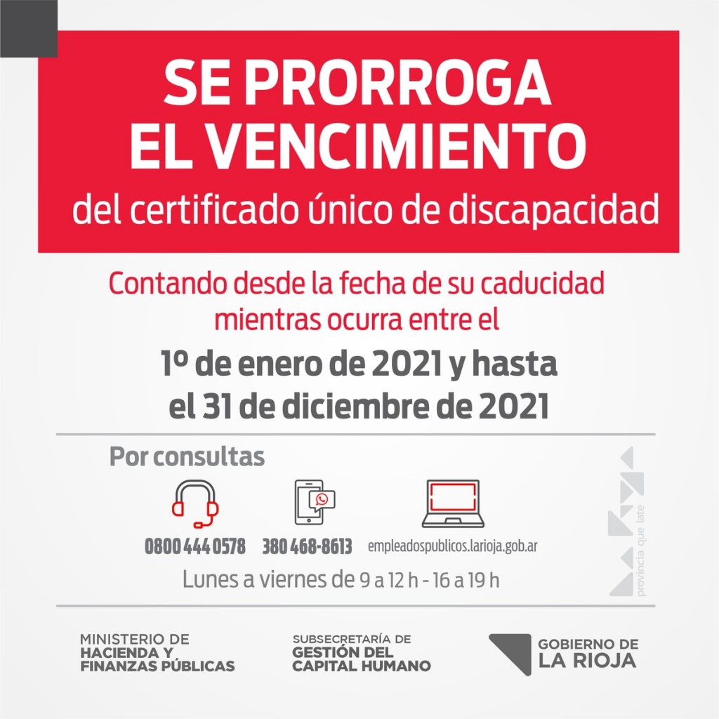 El Ministerio de Hacienda y Finanzas Públicas a través de la Subsecretaría de Gestión del Capital Humano informa en base al art. 1 de la resolución N° 209/20 de la Agencia Nacional de Discapacidad prorrogar por el término de un año, contando desde la fecha de su vencimiento, los certificados únicos de discapacidad emitidos en virtud de las leyes N° 22.431 (y sus modificatorias) y N° 24.901 que su caducidad ocurra entre el 1° de enero de 2021 y hasta el 31 de diciembre de 2021, inclusive.