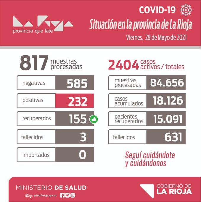 En estos momentos tenemos 18.126 casos acumulados, se recuperaron 155 personas, haciendo un total de 15.091 recuperados, tenemos 2.404 casos activos y 631 fallecidos. De las muestras positivas 79, son de la Capital y 153 del interior