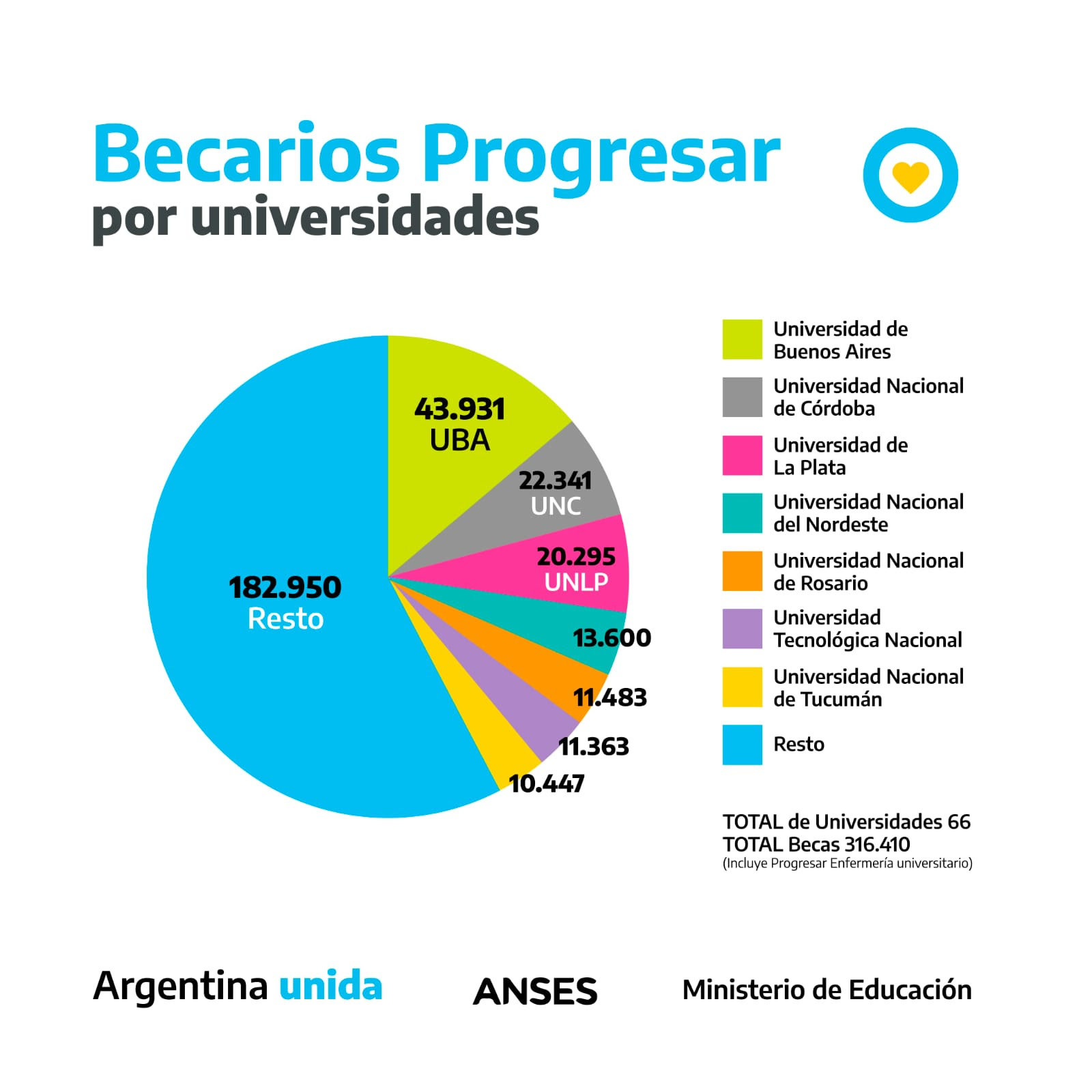 En relación a las Universidades, de un universo total de 66 casa de altos estudios cuyos estudiantes perciben 316.410 becas (se incluye el universo de estudiantes de Progresar Enfermería Universitaria), se destacan en cantidad de asignaciones la Universidad de Buenos Aires (43.931), la Universidad Nacional de Córdoba (22.341), Universidad de La Plata (20.295), la Universidad Nacional del Nordeste (13.600), Universidad Nacional de Rosario (11.483), Universidad Tecnológica Nacional (11.363) y la Universidad Nacional de Tucumán (10.447).