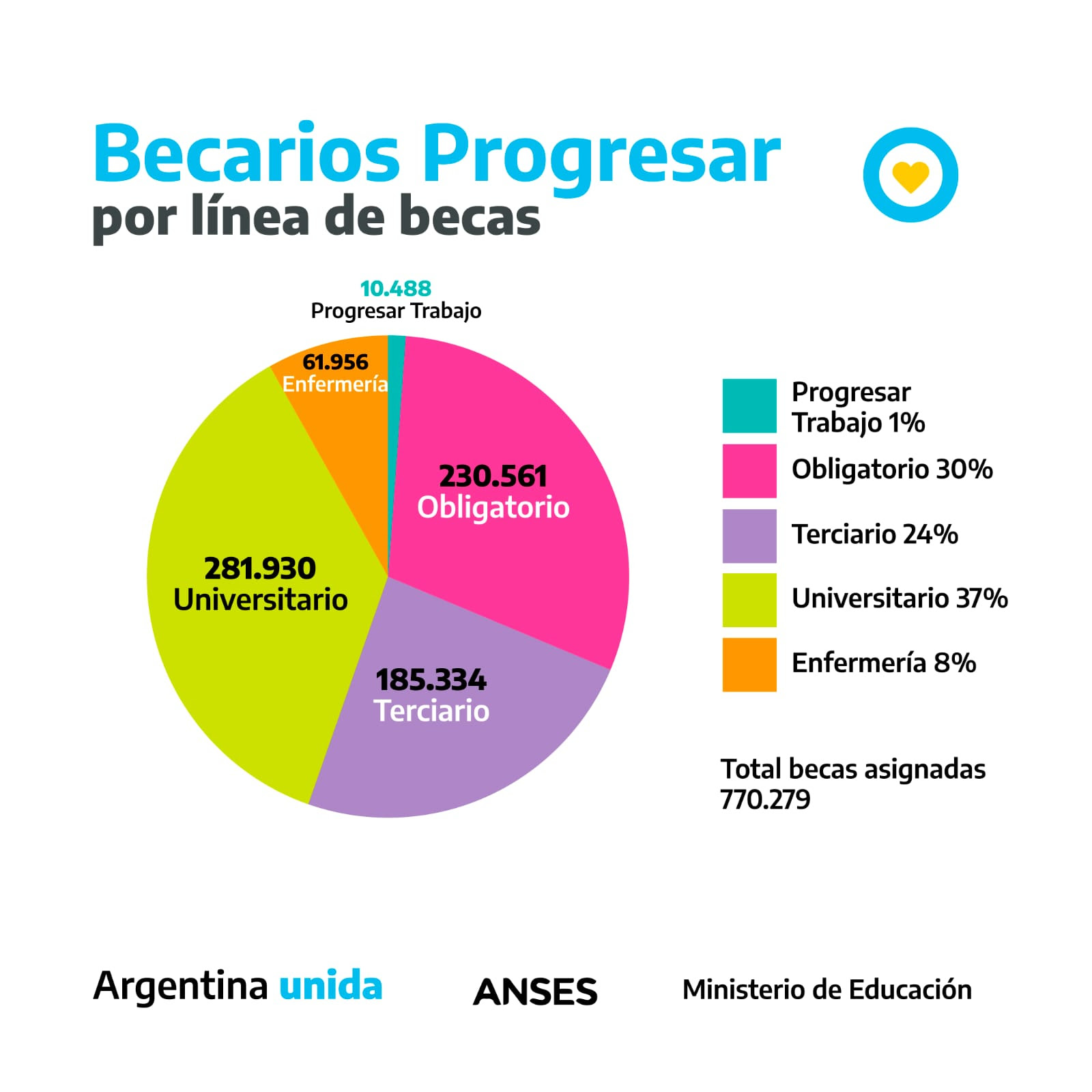 El Ministerio de Educación de la Nación anunció la adjudicación de 770.279 becas correspondientes al Programa de Respaldo a Estudiantes Argentinos (Progresar). Las mismas son percibidas por las y los estudiantes que se inscribieron a las líneas Progresar Obligatorio, Terciario, Universitario, Trabajo y Enfermería.