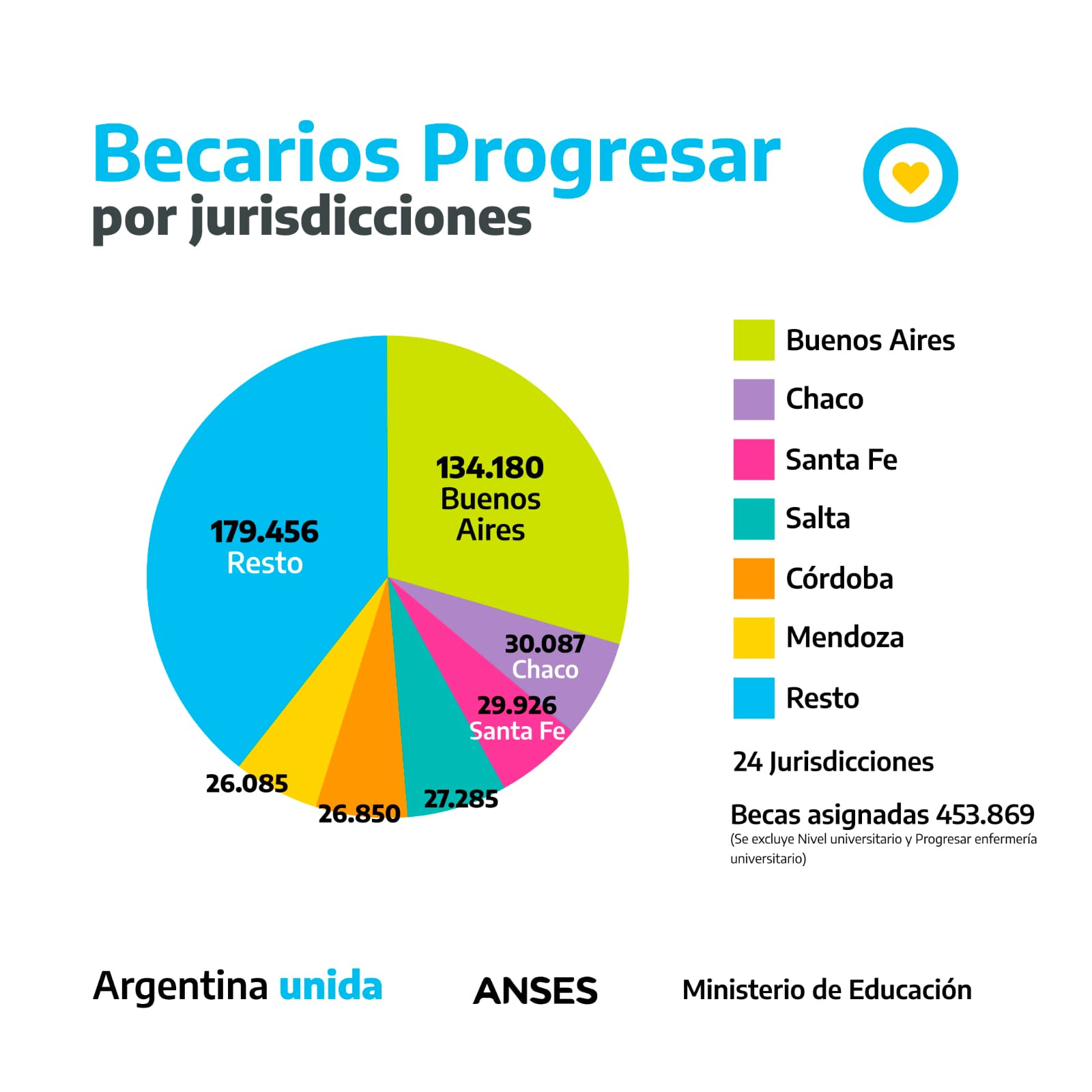 La distribución por jurisdicción de Progresar Trabajo, Obligatorio, Terciario y Progresar Enfermería Terciario, de un total de 453.869 becas asignadas, las y los estudiantes de las provincias de Buenos Aires (134.180), Chaco (30.087), Santa Fe (29.926), Salta (26.850) Córdoba (27.285) y Mendoza (26.085), encabezan la lista.