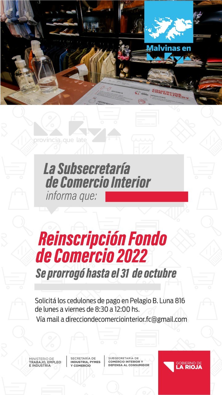 El Ministerio de Trabajo, Empleo e Industria de la Provincia, a través de la Secretaría de Industria y de la Subsecretaría de Comercio Interior, informó que se prorrogó hasta el 31 de octubre la reinscripción al Fondo de Comercio 2022 destinada a comerciantes y prestadores de servicios.