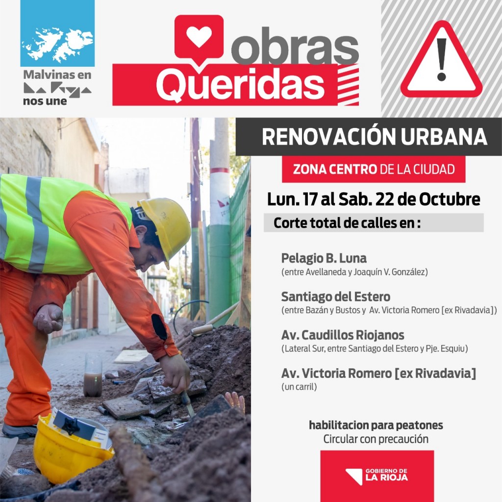 Las arterias afectadas desde el 17 al jueves 20 de octubre son: Pelagio B. Luna (entre Avellaneda y Joaquín V. González), Santiago del Estero (entre Bazán y Bustos a Av. Rivadavia), Av. Caudillos Riojanos lateral sur (entre Santiago del Estero y Pje. Esquiu), Victoria Romero ex Av. Rivadavia (un carril).
