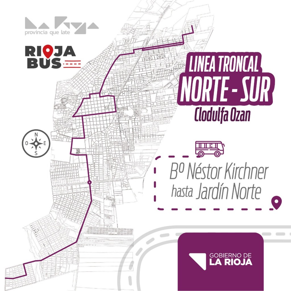 En la primera etapa de Rioja Bus, se implementarán 3 líneas troncales: Norte- Sur Clodulfa Ozán, Oeste Victoria Romero, Este Rosario Vera Peñaloza y 5 líneas complementarias que conectarán las principales avenidas y barrios de la provincia. Cabe subrayar que en una segunda etapa se sumarán más unidades para una mejor cobertura.